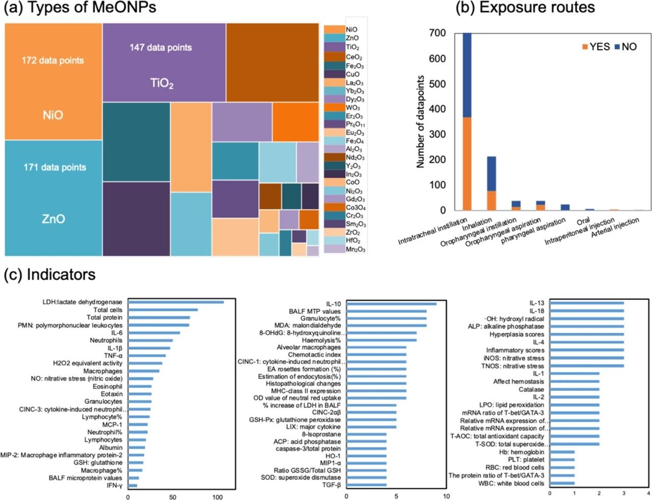 图2 数据集概述。(a) 金属氧化物纳米粒子(MeONPs)的独特化学成分类型。彩色块的面积表示数据点的数量。(b) 动物实验中的暴露途径。YES:体内肺毒性数据点;NO:无体内肺毒性的数据点。(c) 肺毒性的体内毒理学指标。
