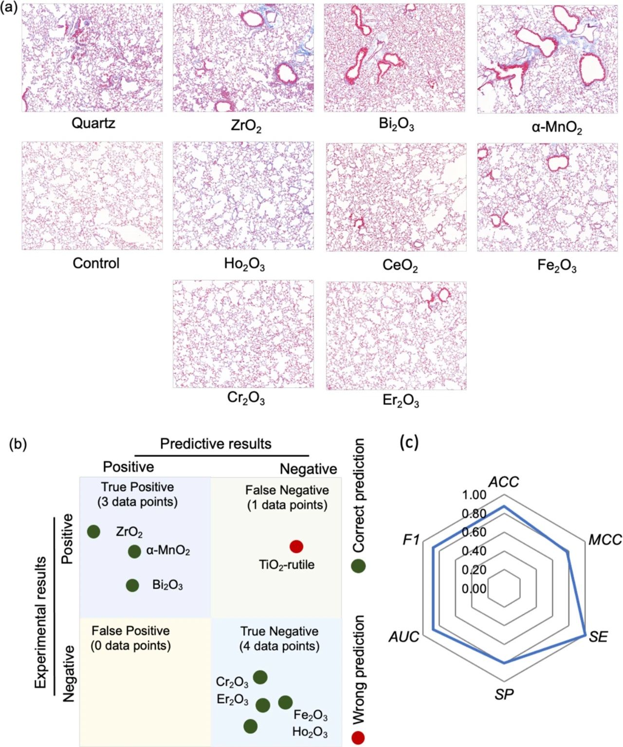 图4 (a) 选择性金属氧化物纳米粒子(MeONPs)诱导小鼠肺纤维化。(b) 肺毒性实验结果与预测结果的比较。(c) 模型的整体性能。