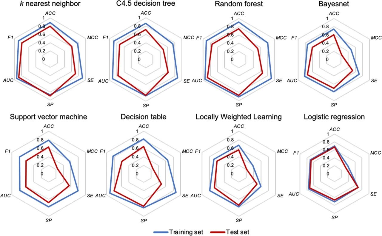 图3 使用不同算法开发的八个模型的性能(如子图标题所示)。
