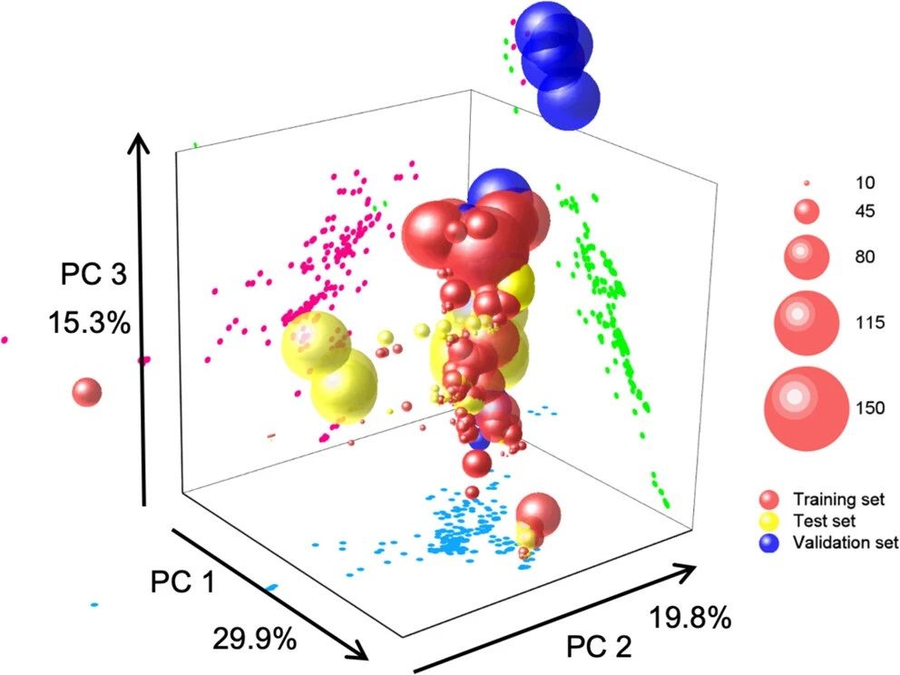 图5 基于描述符值的主成分分析所反映的1134个数据点的分布。纳米粒子的大小反映在球的大小上。还显示了所有MeONP在三个平面上的投影。