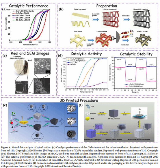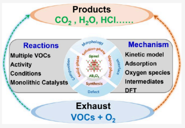 催化性能: 尖晶石催化剂在多种VOCs的催化氧化中表现出优异的性能,特别是在低温条件下。研究总结了不同尖晶石催化剂对甲烷、丙烷、甲苯等VOCs的催化活性,并比较了其性能。