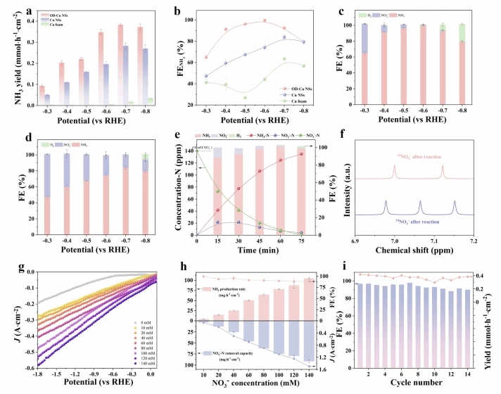 图3:eNO3RR的性能。使用Cu泡沫、Cu NSs和OD-Cu NSs催化10 mM NO3−还原时的a NH3产率和(b) 对应的FEs。c, d (c) OD-Cu NSs和(d)Cu NSs的产物分布。e 使用OD-Cu NSs催化10 mM NO3−还原时NO3−、NO2−和NH3浓度随时间的变化情况。f OD-Cu NSs催化15NO3−或14NO3−还原样品的1H NMR谱图。使用OD-Cu NSs催化10 ~ 140 mM NO3−还原时的g LSV曲线,和(h) 硝酸盐去除性能和NH3产率。i 在−0.6 V(Na2SO4电解质)下,10 mM NO3−还原连续14次循环时OD-Cu NSs的稳定性。误差条表示三个独立测量的标准差。所有的势都没有经过iR校正。