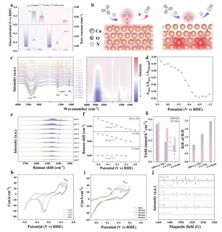 图4 *NO2转化和*H生成机理分析。a 在0.5 M Na2SO4 + 10 mM NO3−/NO2−条件下,OD-Cu NSs、Cu NSs和Cu泡沫上NO3−转化为NO2−的起始电位和反应常数(k1)和NO2−转化为NH3的起始电位和反应常数(k2)(误差条表示三次独立测量的标准差)。b 晶格氧引起的中间体吸附在Cu表面的示意图。c operando ATR-FTIR光谱和二维FTIR等高线图。不同电位下OD-Cu NSs上eNO3RR过程中不同界面水的d ANO2/ANO2 + ANH2OH和e 原位拉曼光谱。f 悬挂状态O-H的波数移位随电位变化情况。g 在−0.6 V下,以H2O和D2O为溶剂,eNO3RR的NH3产率和KIE值。(h) 在不同启动电位、Ar饱和0.5 M Na2SO4和(i) 不同NO3−浓度下OD-Cu NSs的循环伏安图。j −0.6 V下,添加和不添加硝酸盐时OD-Cu NSs、Cu NSs和Cu泡沫的*H信号EPR谱。所有的势都没有经过iR校正。