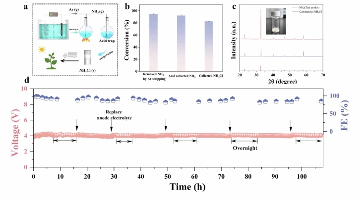 图6:氨回收率和稳定性。a 将硝酸盐转化为高纯度NH4Cl过程的示意图。b 在−1.1 A cm−2下还原100 mM NO3−合成NH3的转化效率(误差条表示三个独立测量的标准差)。c 合成NH4Cl产物的XRD图谱。d 使用MEA系统(30 mM NO3−,1.0 A, 4.0 cm2, Na2SO4电解质)的OD-Cu NSs上eNO3RR的长期稳定性。