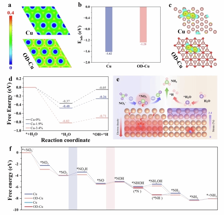 图5:DFT计算的反应机理。Cu和OD-Cu表面NO2-的a ELF 图和(b) 吸附能。c Cu和OD-Cu的吸附模型和电荷密度差(电子的积累和缺失用蓝色和黄色表示)。d 在Cu-0%、Cu-1.9%和Cu-3.4%表面上H2O解离生成*H的Gibbs自由能。e 晶格氧导致的电子调节和晶格应变导致的水解离促进eNO3RR的示意图。f 在Cu和OD-Cu表面eNO3RR的吉布斯自由能图。