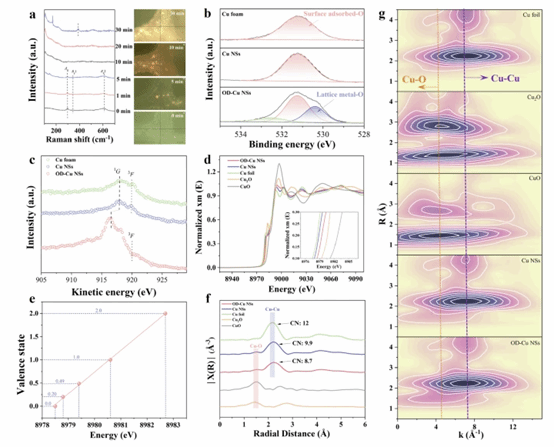 图2:结构表征。a 在−0.87 V下OD-Cu NSs表面的operando拉曼光谱(左图)和时间分辨光学显微镜图像(右图)。Cu泡沫、Cu NSs和OD-Cu NSs的b O 1s XPS光谱和(c) Cu L3M45M45俄歇光谱。d Cu K边XANES光谱。e 拟合的价态。Cu箔,Cu2O, CuO,Cu NSs和OD-Cu NSs的f 对应的k3加权FT-EXAFS光谱和(g) k3加权EXAFS数据的Morlet WT。