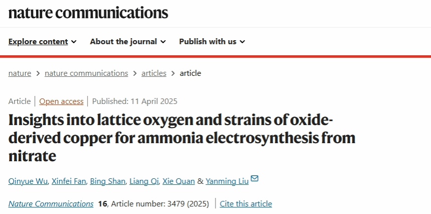 2025年4月11日,我院刘艳明教授团队在Nature Communications期刊发表题为“Insights into lattice oxygen and strains of oxide-derived copper for ammonia electrosynthesis from nitrate”的研究论文,团队成员吴钦岳为论文第一作者,刘艳明为论文通讯作者。