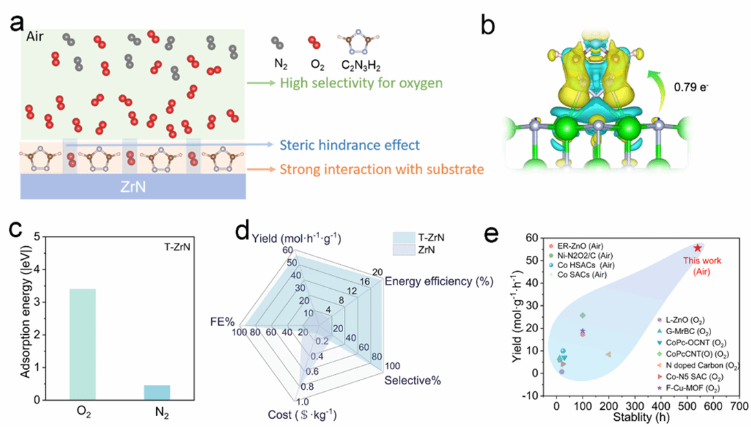 图1三唑配体在2e- ORR中的作用。(a)三唑配体对2e- ORR反应的影响示意图。(b)T-ZrN的电荷密度分布。(c)O2和N2在T-ZrN上的吸收能量。(d)T-ZrN和ZrN的2e- ORR性能对比。(e)与近期报道的催化剂的性能比较。
