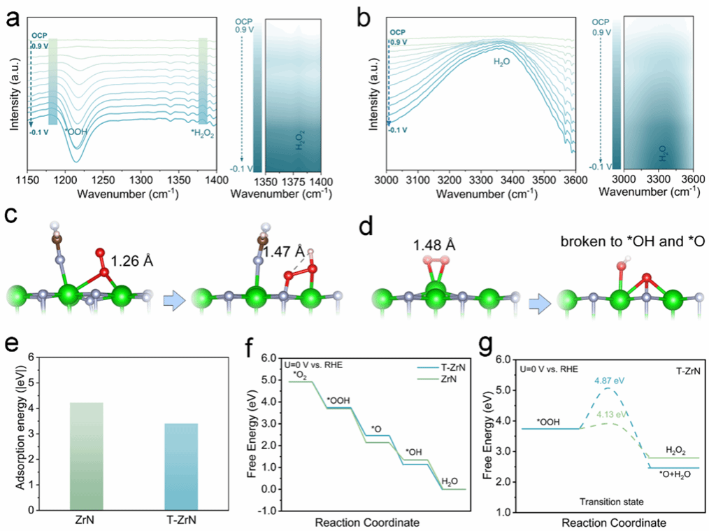 图5. 2e- ORR 的反应机理。(a, b) T-ZrN 的原位衰减全反射表面增强红外吸收光谱 (ATR-FTIR)。(c) T-ZrN 上 O2到 OOH 的结构模型。(d) ZrN 上O2到 OOH 的结构模型 (e) T-ZrN 和 ZrN 上 O2的吸收能。(f) T-ZrN 和 ZrN 上ORR 的自由能图。(g) T-ZrN 和 ZrN 上 *OOH 到 H2O2的能垒。