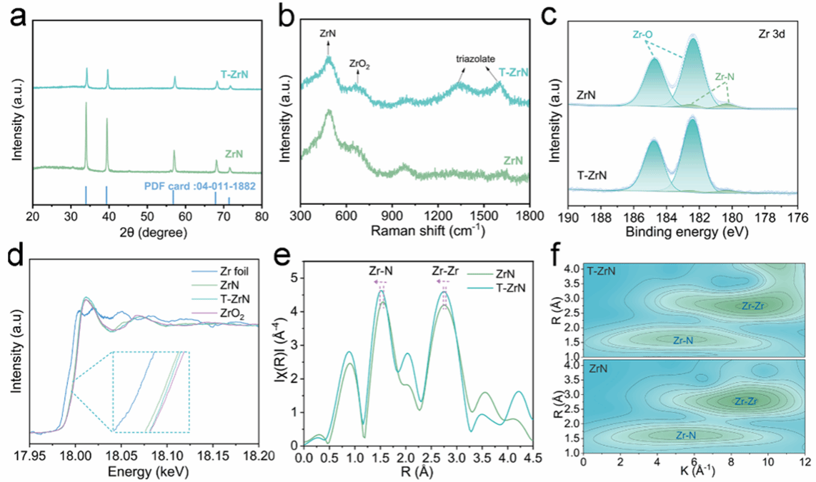 T-ZrN样品的粉末 X 射线衍射(XRD) 图谱均表现出与标准 ZrN 相一致的特征衍射峰。拉曼光谱在约 484.7 和 666.2 cm-1处出现的两个峰归属于 Zr–N 和 Zr–O 键的伸缩振动,而在 1336.9 和 1601.6 cm-1的峰则对应于三唑环的伸缩振动。XPS 分析表明,T-ZrN 中Zr–N/Zr–O显著降低,且 O 1s 光谱显示氧化信号增强,说明表面发生部分氧化。XANES 结果进一步表明,T-ZrN 的边缘特征能量相较于原始 ZrN 略有正移,反映了 Zr 平均价态的升高,归因于电子由 ZrN 向三唑钠配体转移。EXAFS 光谱在约 1.54 Å 和2.76 Å 处对应 Zr–N 和 Zr–Zr 配位,T-ZrN 相比原始 ZrN 出现轻微收缩,表明表面配体与 ZrN 之间存在强相互作用并改变了局域结构。