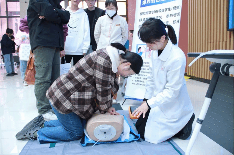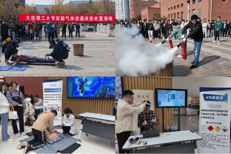 在活动中,大连大特气体有限公司专家以实验气瓶使用安全为例,结合事故案例,从合规购买、合理使用、风险管理、应急处置以及现场救援人员救治常用方法等方面进行了集中培训;以气瓶硫化氢泄漏为背景,按照应急处置预案,对事故发现、信息报告、疏散警戒、人员抢救、险情控制、现场善后等环节进行了模拟演练,并邀请现场师生参与灭火器、灭火毯、自动体外除颤器、心肺复苏术等常用设备和方法进行应用体验;同时,在知渊楼一楼展厅设置应急物品展示及用法讲解、安全与应急知识问答、心肺复苏术学习、VR体验等活动专区,辅助在场师生学习了解安全应急知识和技能。