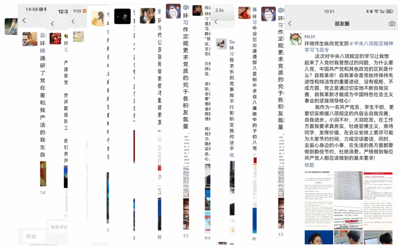 “精简会议活动”不仅是减少形式主义的刚性要求,更是提升学习效率的创新契机。“飞花令”这一学习形式,在党支部里创新实施至今已有3年,也受到了党员们的一致欢迎。本次学习教育中党支部继续坚持通过“飞花令”学习模式,打破冗长死板,实现精简见效,实现“随时随地学、随时随地悟”。全体党员通过共产党员网、学习强国app、大工党校公众号等多种线上途径进行学习中央八项规定精神,并在朋友圈发布学习感悟,形成“一人分享、全员共鸣”的互动热潮。大家都深受启发并且提到要力所能及地去落实,党员刘艺璇在朋友圈写道:“无论在学术研究还是日常生活里,我们都应秉持务实态度,杜绝浮躁与虚假。”黄鹏斐同志也表示今后不仅在工作上要求真务实,更要在生活的各方面都做到勤俭节约,严格做到每位共产党人都应该做到的基本要求。