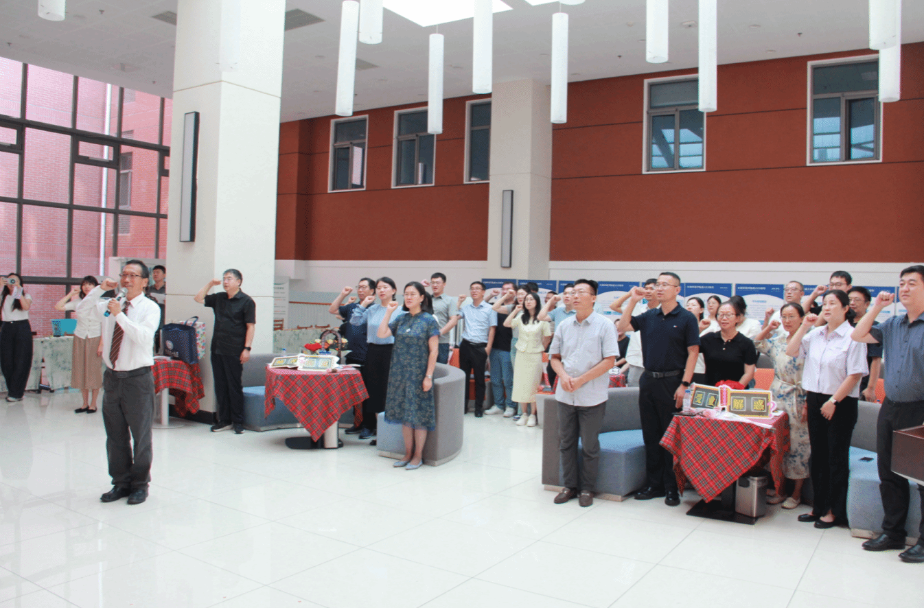 学院领导及教师代表为曹佩珂、董翠等七位新教工佩戴校徽、颁发入职纪念品,标志着太阳成tyc7111cc大家庭注入新鲜活力。在荣休教师李新勇的领誓下,全体教师肃立重温人民教师誓词,铿锵有力的誓言回荡中厅,诠释着全体教师“为党育人、为国育才”的坚定初心。